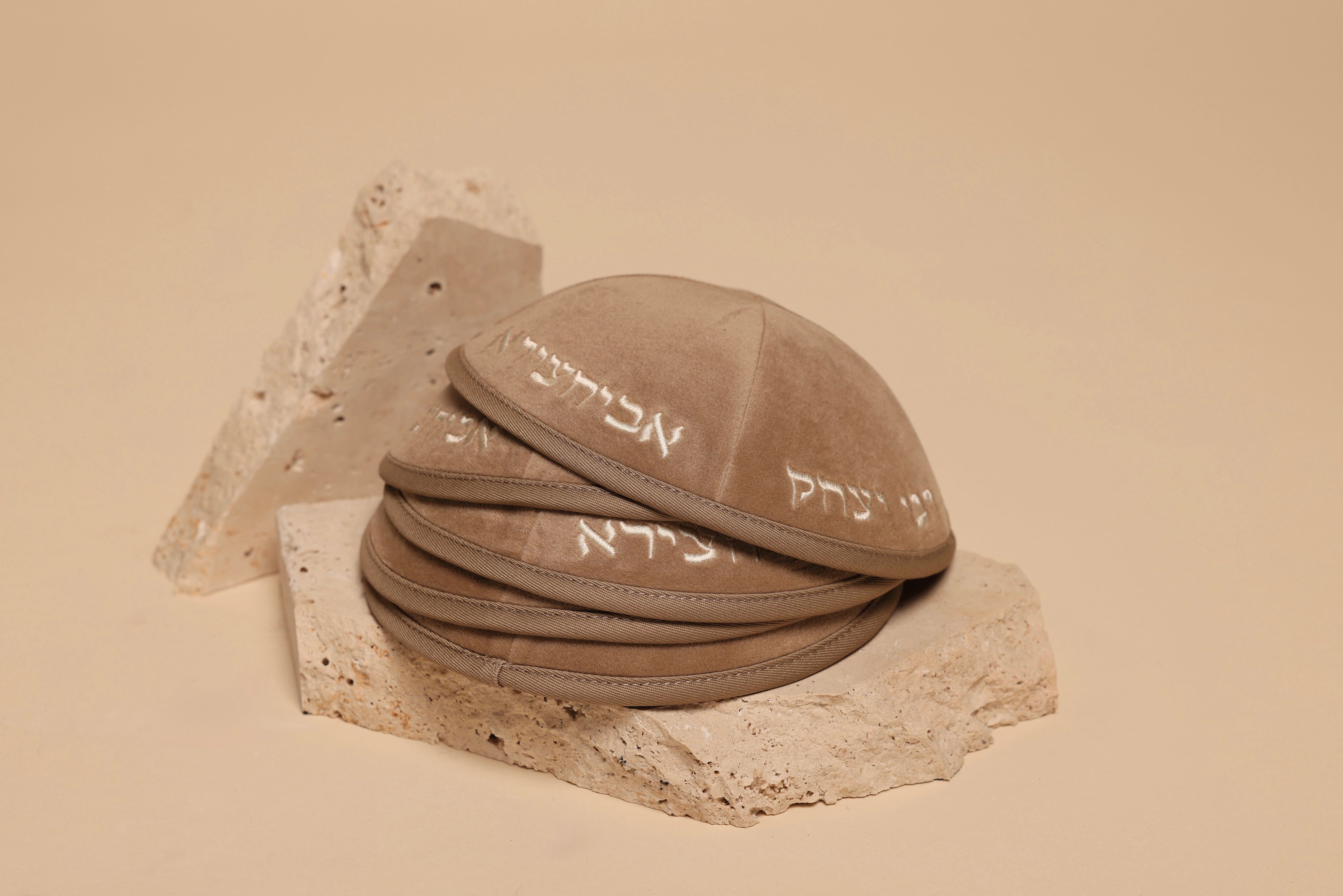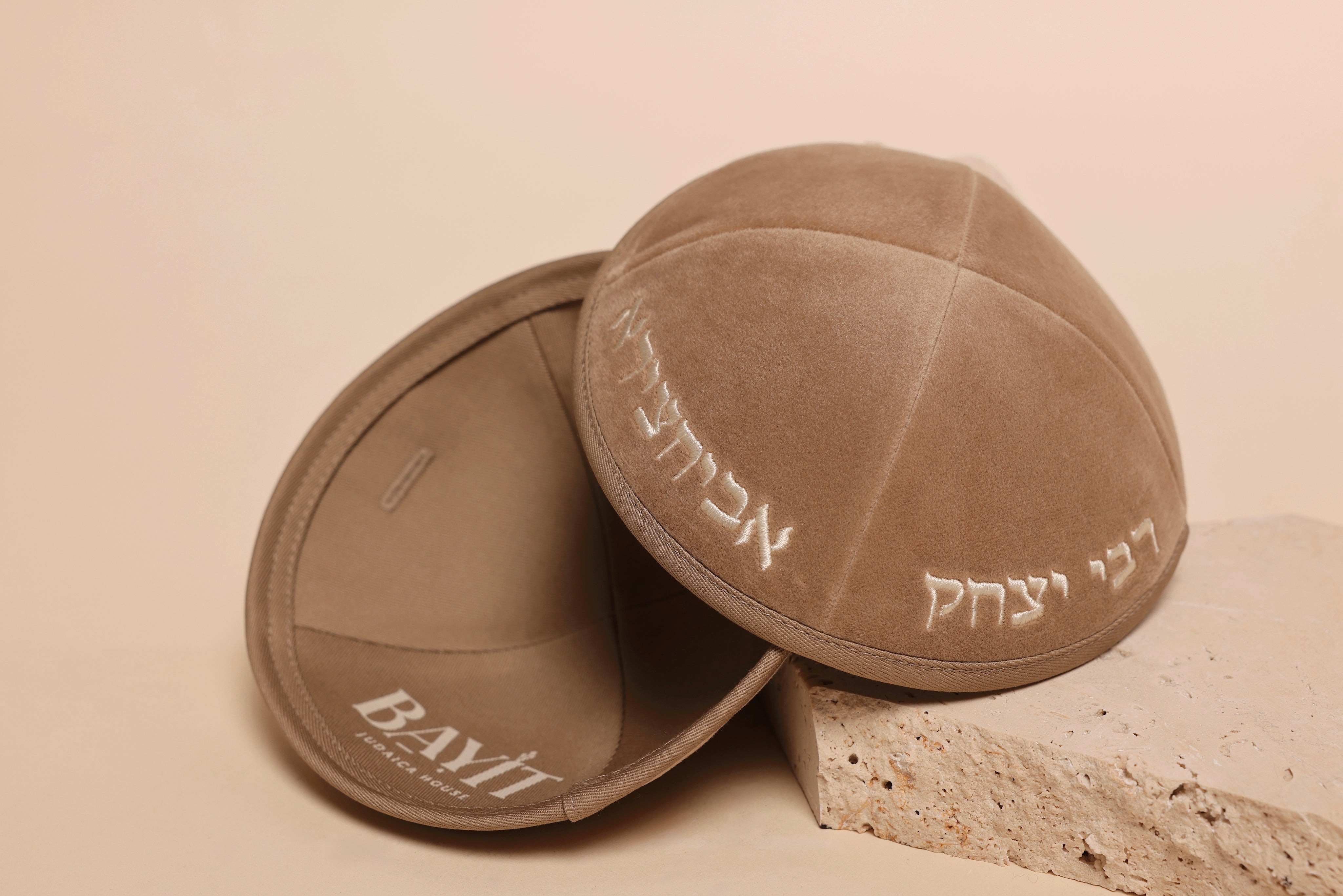 A warm brown velvet kippah honoring Rabbi Yitzchak Abuchatzeira, representing wisdom, faith, and strength. Crafted with smooth velvet and delicate embroidery, it embodies timeless devotion.